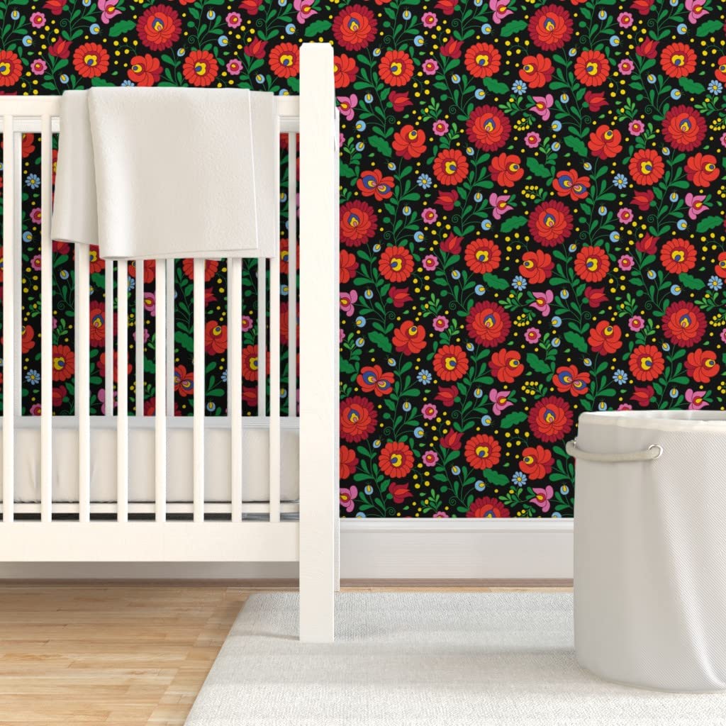 Commercial Grade Wallpaper 27ft X 2ft Folk Art Black Flowers Floral Vibrant Scandinavian Traditional Wallpaper By Spoonflower Amazon Com